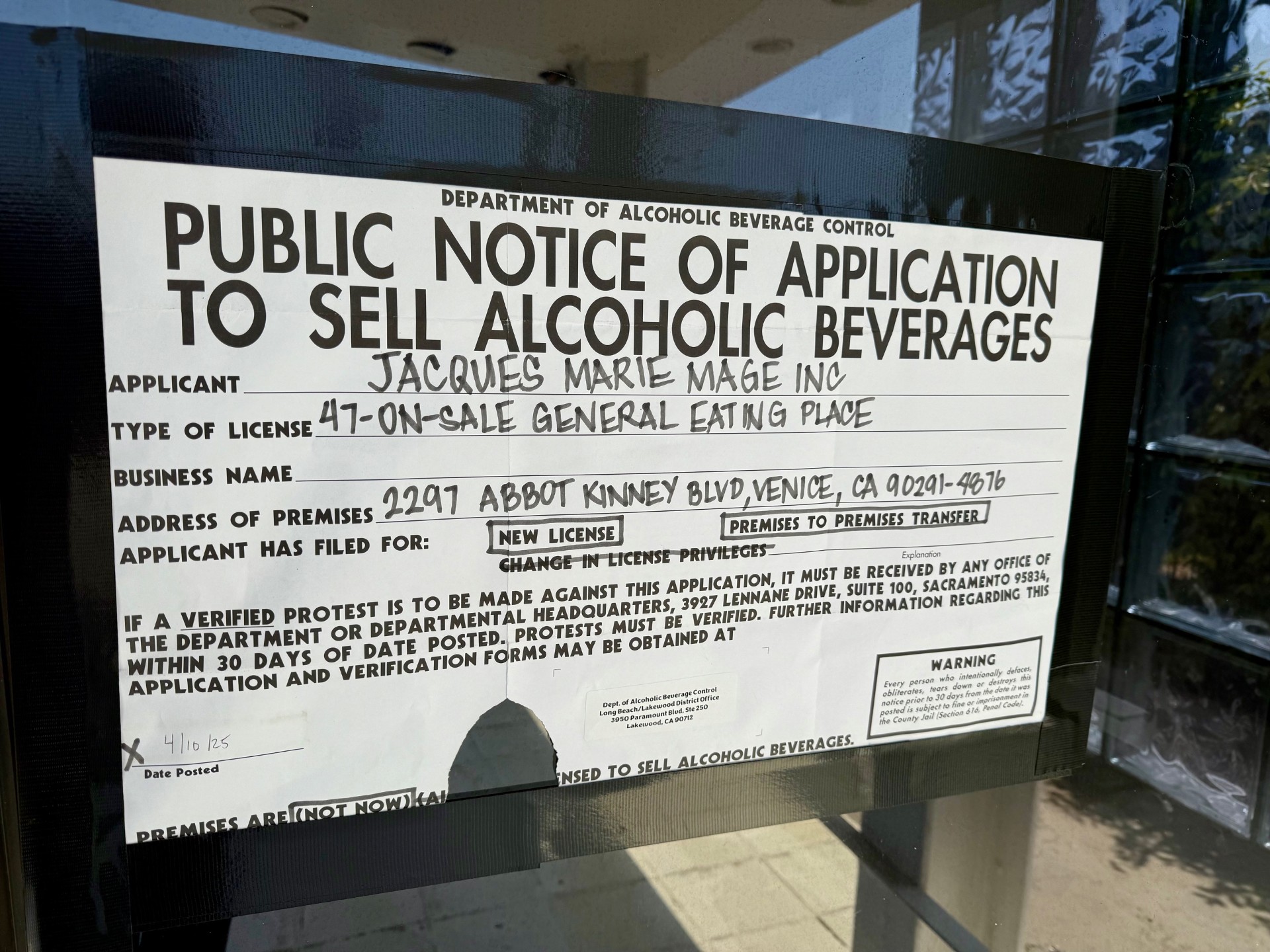 LA-based exclusive eyewear designer Jacques Mari Mage is known for cutting-edge limited-edition glasses. What they are not known for is dining… until now? There is an ABC application in the window of the build-out at 2297 Abbot Kinney in Venice listing the applicant of the new “general eating place” as none other than Jacques Marie Mage. The business name is not listed, but JMM has a boutique just across the street. I guess we’ll have to wait and see what develops.