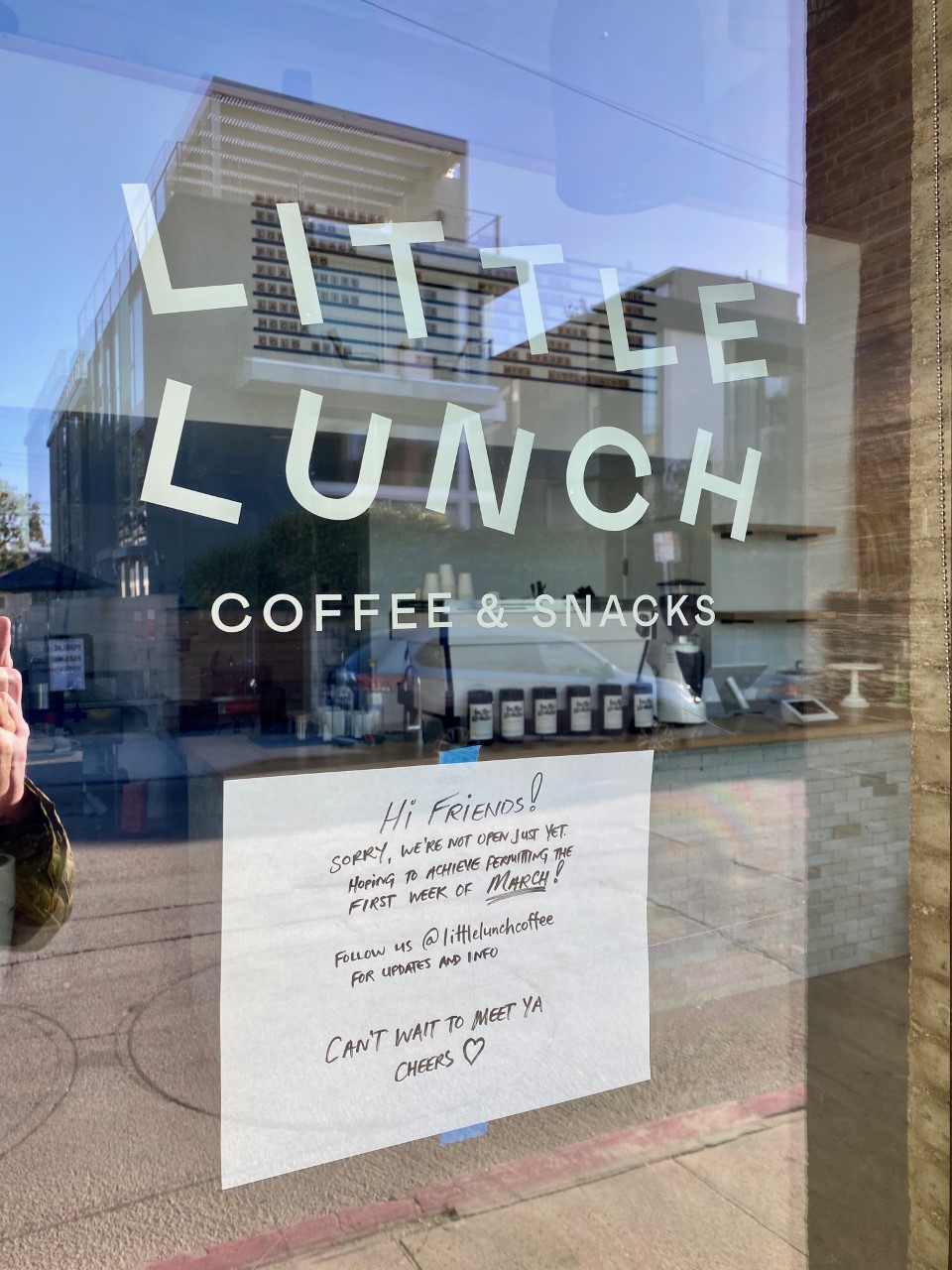 It looks like a sunny new coffee joint is ready to charm Venice from their location at 50 Brooks Ave. (corner of Pacific). While they’ve been working on it for a while, there’s now a neighborly hand-written note on the front door of Little Lunch Coffee + Snacks saying that they will be opening, well… now. Apparently they are waiting on their permits. We wish them the best of luck.