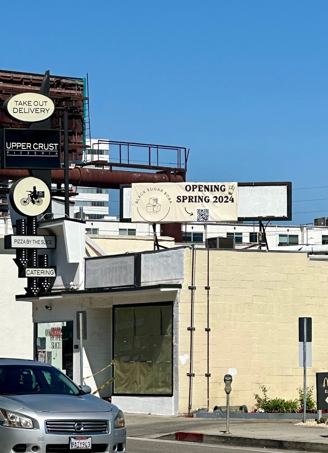 The former bank building on the corner of Wilshire and Berkley in Santa Monica, now known as Berkley Street Market, has been transforming into a food destination. The Market, which can boast delicious egg tarts at Paderia, burgers at Palms N’ Patties, sando at Katsu Bar, and acai at Oakberry, is now adding another option. Window paper is letting us know that a new purveyor of pies named Pizza Fling is settling in at 1211 Berkley #1.