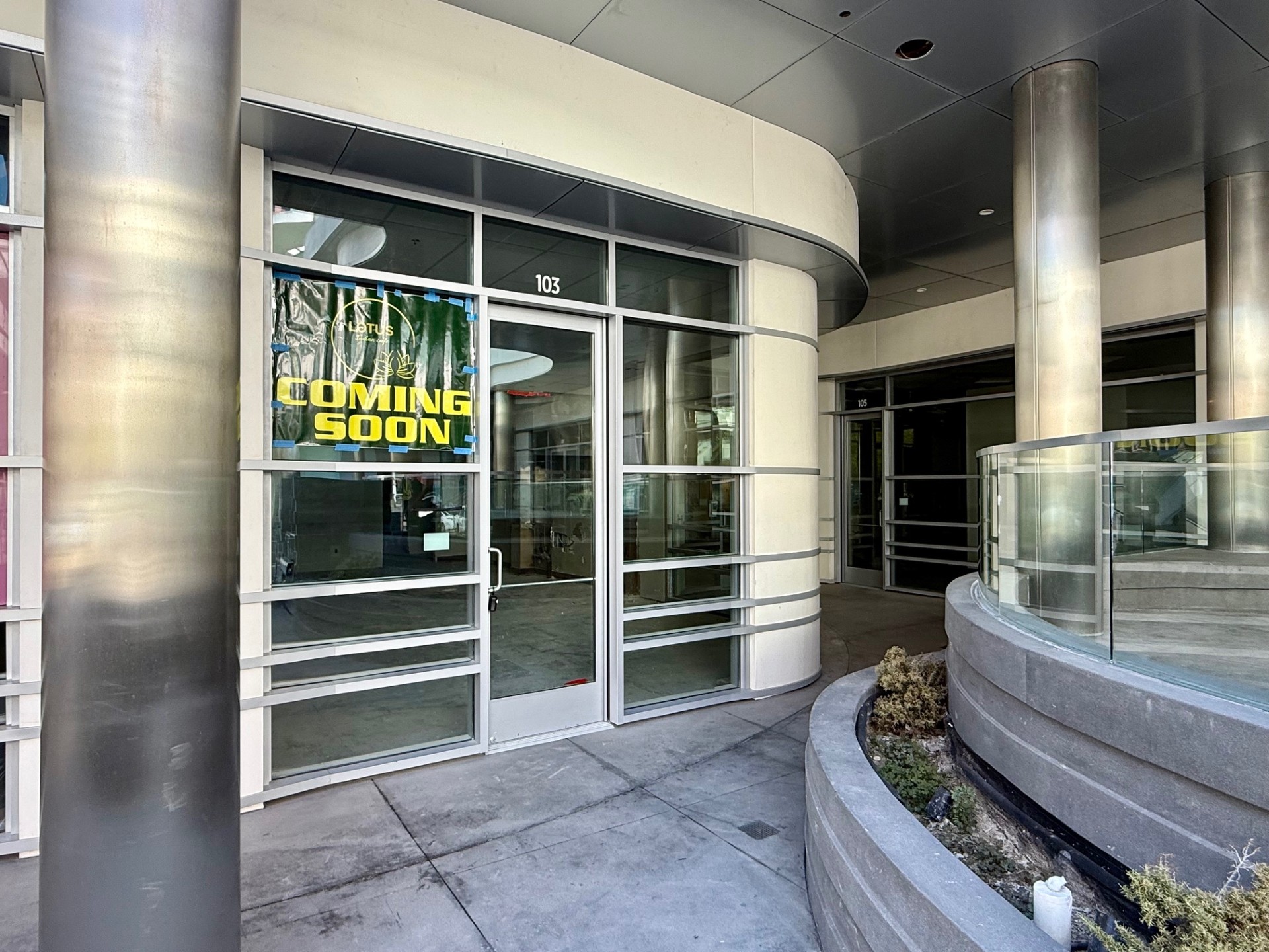 Something new is coming to the glacial redevelopment of The Now shopping center (formerly Granville Plaza) at 11819 Wilshire Blvd in Los Angeles. There’s window paper up on space #103 announcing the arrival of Lotus Indian Cafe. Lotusmenu offers an interesting fusion of Indian and Chinese, Mexican, Italian, and American food. Look for such things as butter chicken pizza, chicken tikka quesadilla, and gobi Manchurian. Lotus doesn’t have a big footprint yet, but you can explore more about them here.