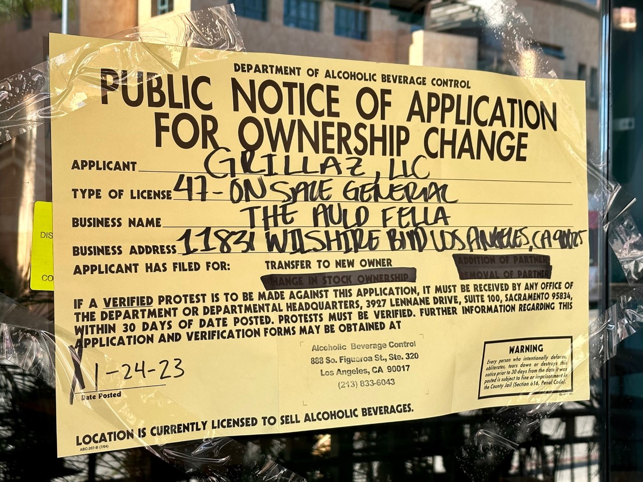You may recall that the Pandemic Closures hit bars particularly hard, and Brentwood’s local watering hole Bru Haus at 11831 Wilshire Blvd. was no exception: It closed in 2020. Then it appeared that the location was going to get an island-themed restaurant named Morabeza, but that never materialized. Now there’s a new ABC application posted on the front listing the new tenant as The Auld Fella. The Auld Fella describes itself as “an Irish joint” and currently has a location in Culver City. Hopefully their arrival will bring new life to Brentwood’s once-thriving bar scene.