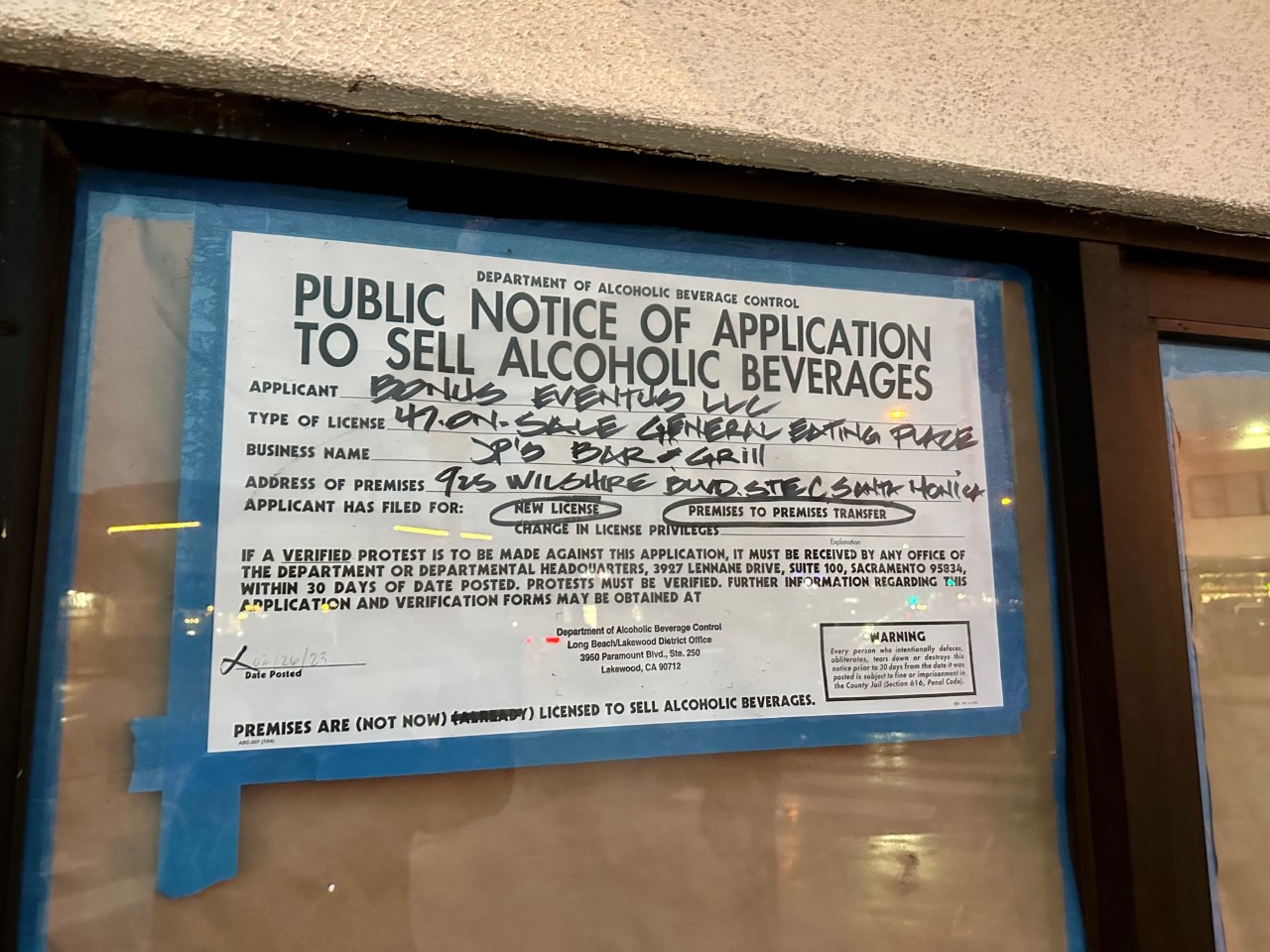 A little over a year ago, I told you about some activity at 925 Wilshire Blvd.# C in Santa Monica. At the time, all I could discern wat the new establishment was associated with JP’s Bar and Grill, a fave neighborhood watering hole at Wilshire and 11th that had shuttered during the Pandemic. I even reached out to the people behind JP’s, but at the time, they didn’t wish to share any details, so I only referred to the location as “a new JP’s project”. Now a liquor license has gone up on the space, (perhaps) putting an end to the mystery. The business name is clearly listed as JP’s Bar & Grill.