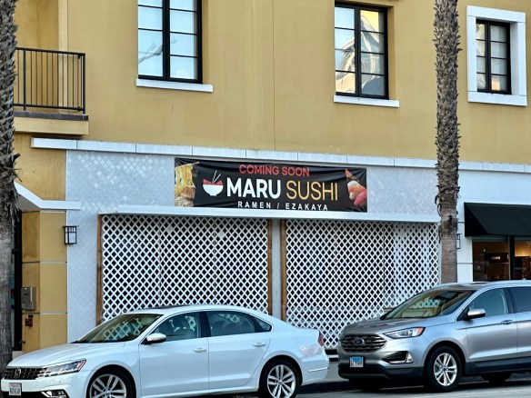 There’s a new banner hanging over 331 Wilshire Blvd. in Downtown Santa Monica. The space has long sat empty since Greenleaf Kitchen & Cocktails closed up shop during The Pandemic. The name on the banner is Maru Sushi and underneath that, it promises “ramen / ezakaya“. I’m unable to find any more information about the new eatery as there are a number or restaurants that use the word “Maru” in their name, so if you know more, reach out to me…
