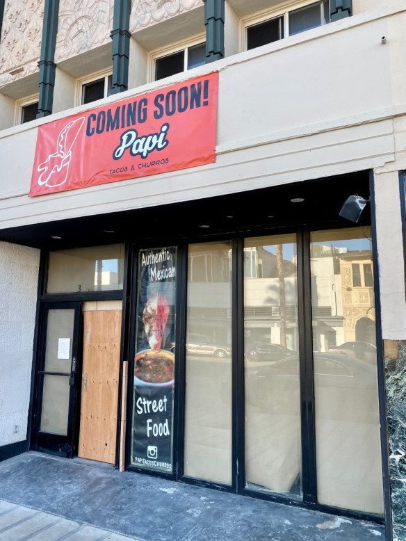 Before the pandemic, window displays went up on the space at 313 Wilshire Blvd. in Downtown Santa Monica announcing that Hollywood Burger would be moving in… and nothing happened. But that arrangement seems to have changed. There’s a new banner over the troubled location letting us know that Papi Tacos & Churros is on the way. Papi’s has a location on Jefferson Blvd. in LA that appears to be “temporarily closed”. I’m not sure if this is a second location or a total move, but in the mean time you can check out their current menu of “authentic Mexican street food” here.