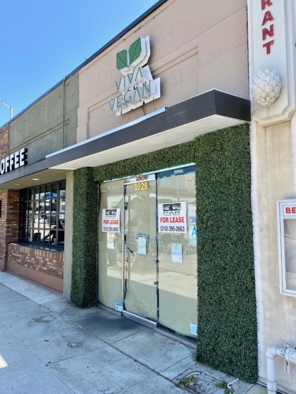 The below-the-radar bolthole Viva Vegan appears to be no more. While there’s still a note on the front door saying that they are temporarily closed, as you can see there are two prominent for lease signs across the front of their location at 1028 Wilshire. This will be a sad loss for the devoted followers of their signature plant-based food.