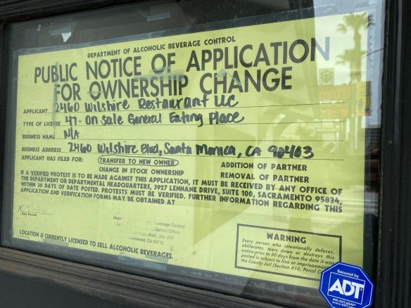 In other bar news, an ABC application recently appeared on the front of the normally crowded neighborhood dive JP’s Sports Bar & Grill, on the corner of 11th and Wilshire in Santa Monica. The application is a transfer to a new owner, so it appears JP’s may be returning. We wish them the best of luck.